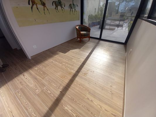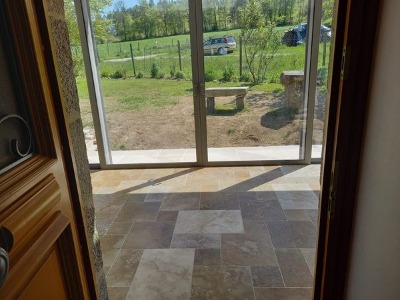 Pose d'un carrelage imitation parquet avec motif au centre toujours dans la véranda