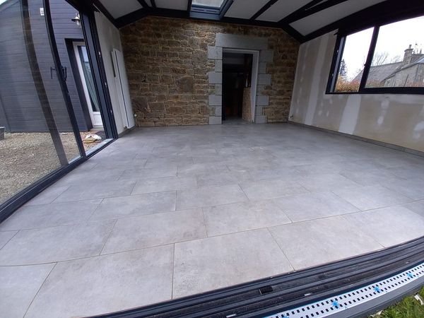 Réalisation d'une maçonnerie de véranda avec isolation des sols et carrelage en partenariat avec Concept Alu Argentan
